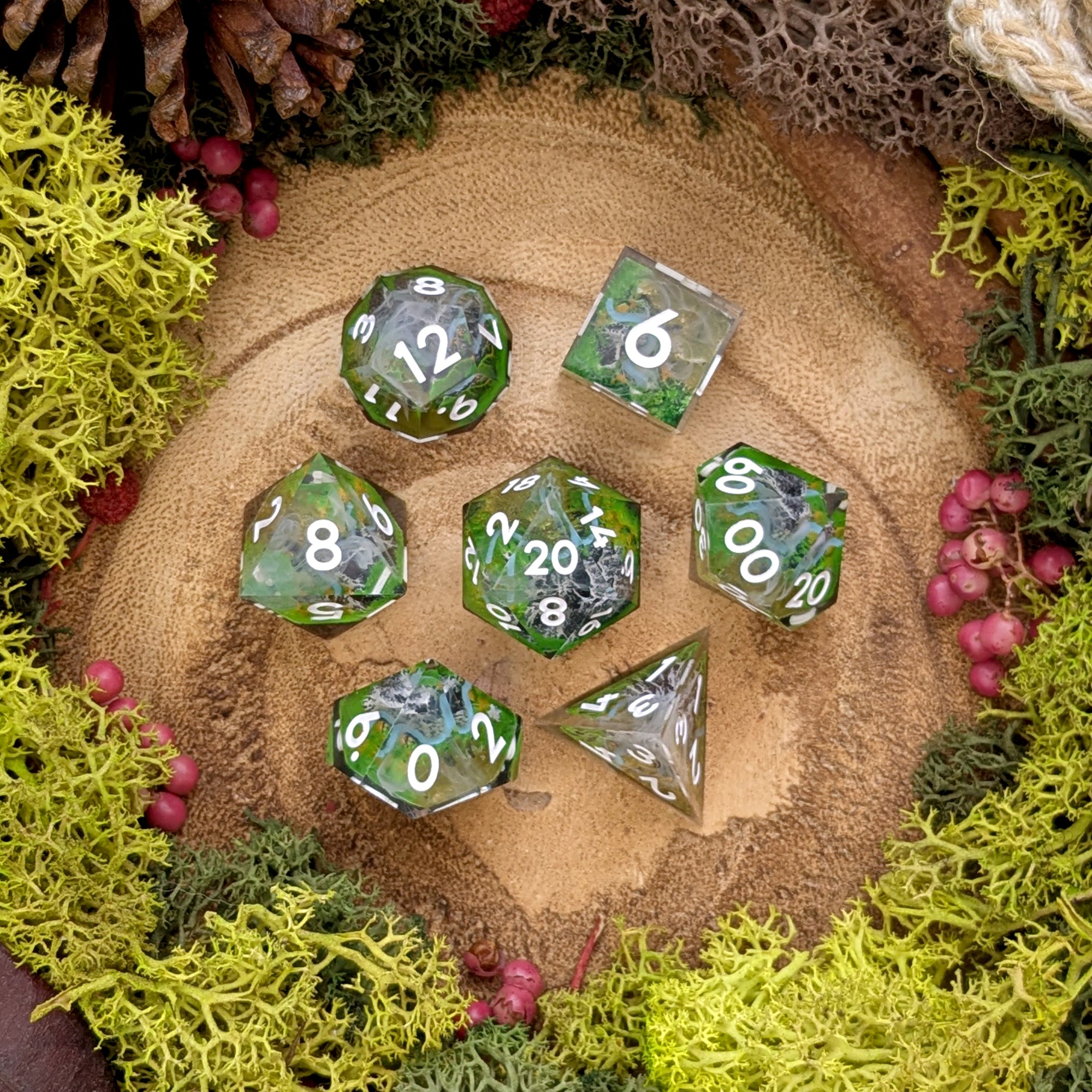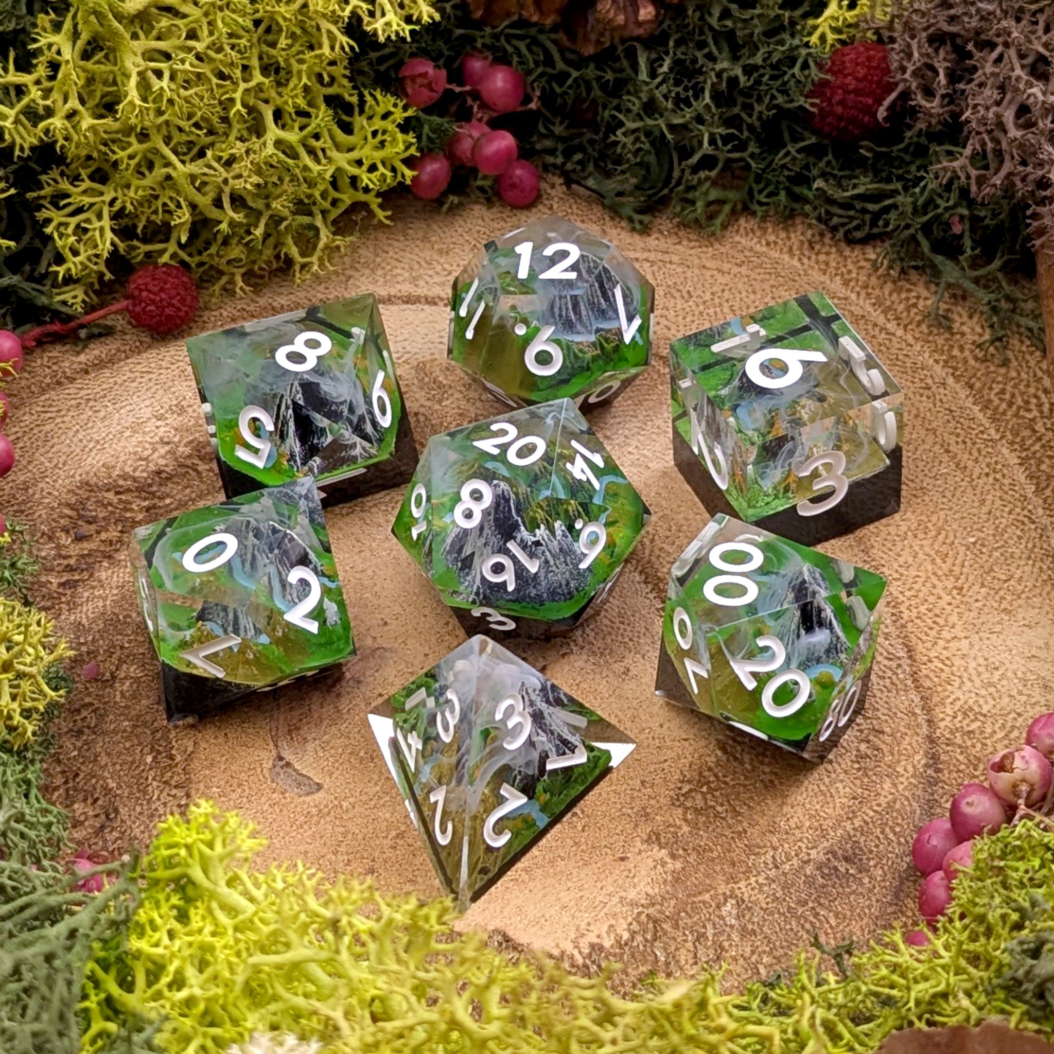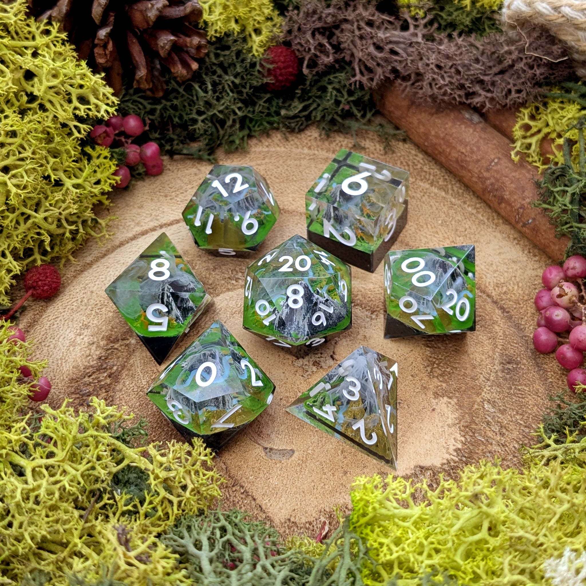 A beautiful set of clear sharp edge resin dice with peaks of white set amongst verdant greenery and wispy clouds.