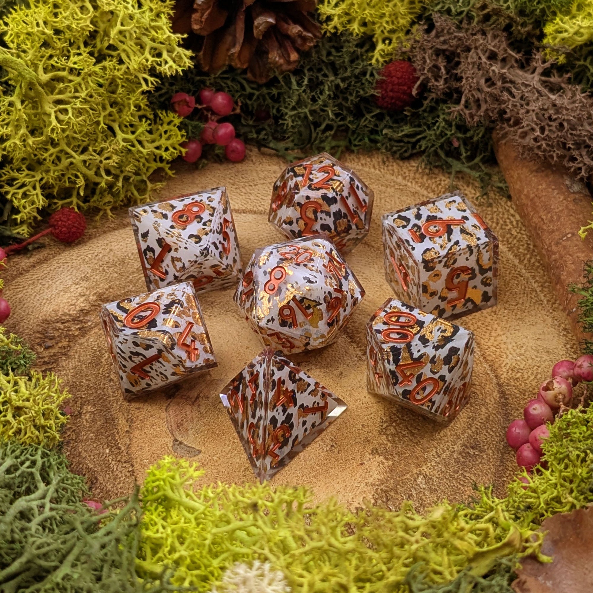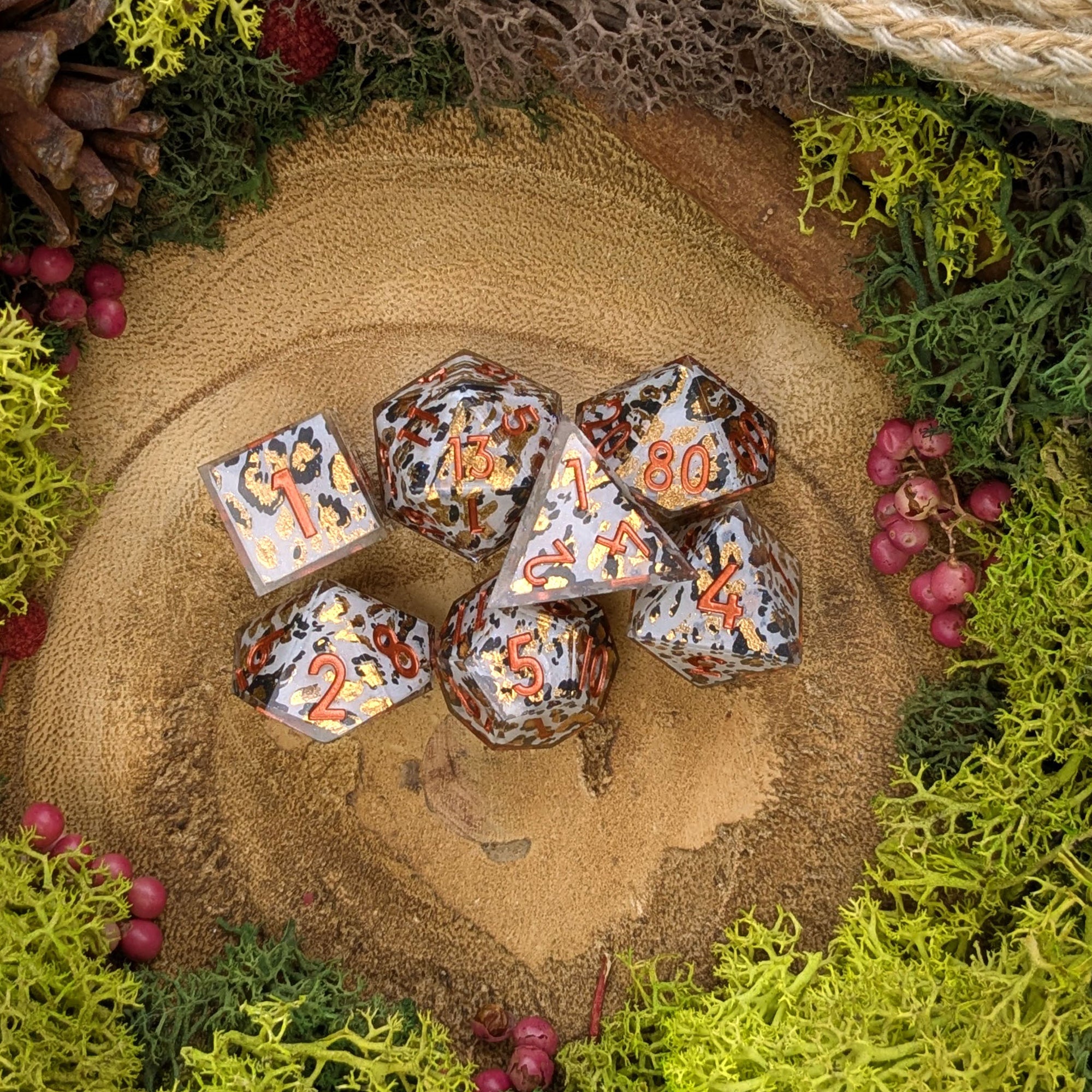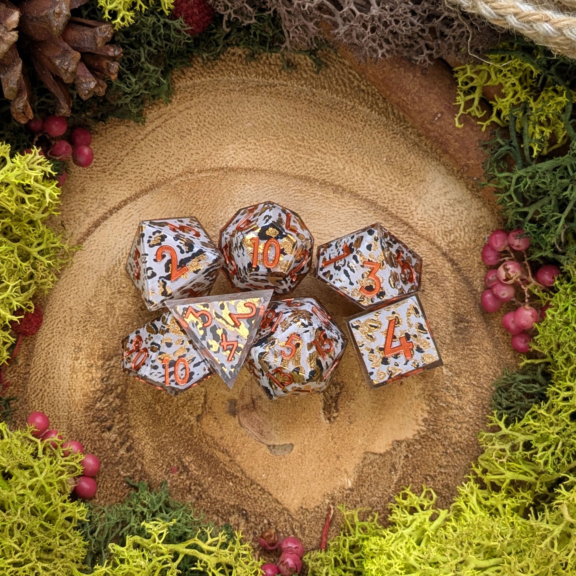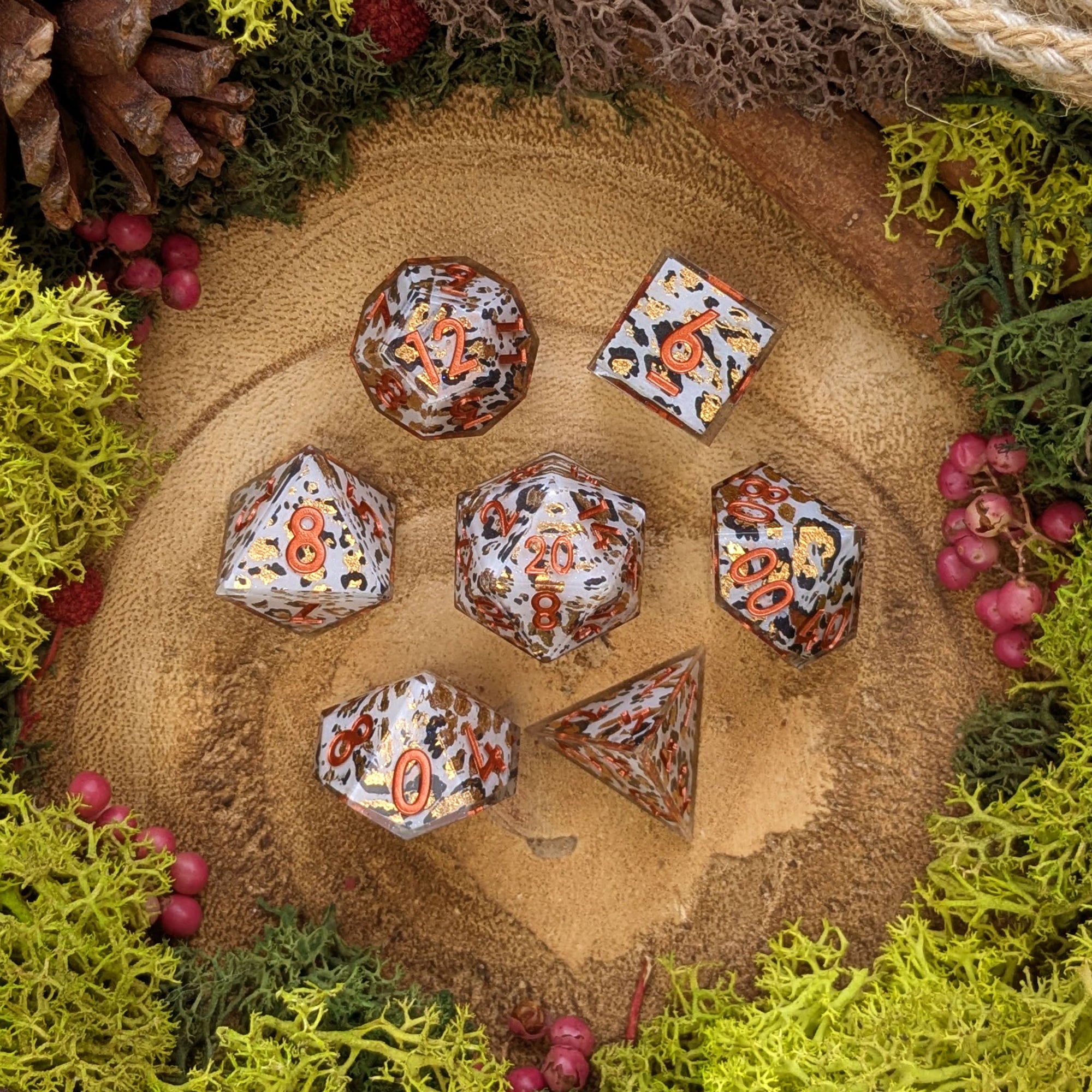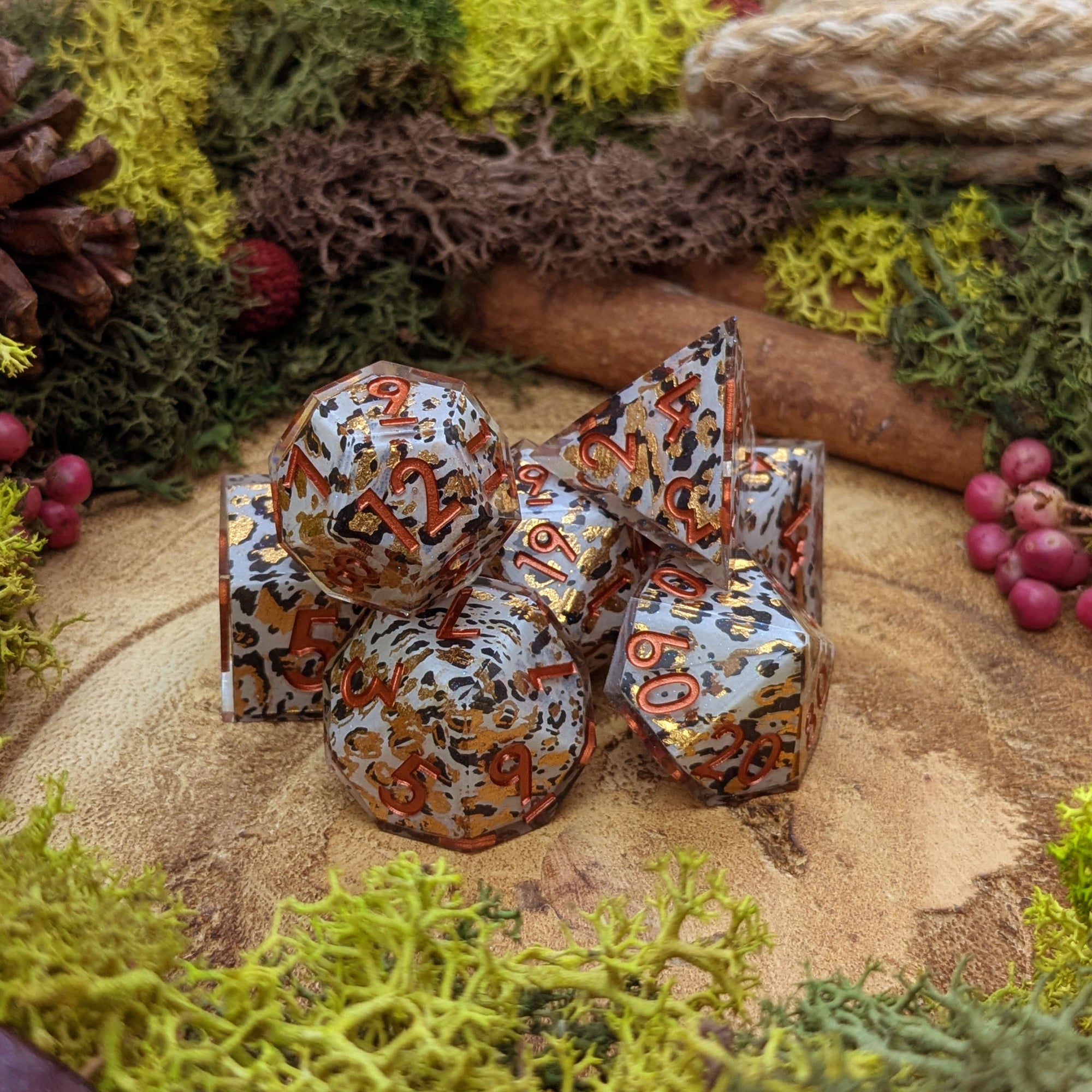 A sharp set of resin dice with gorgeous snow leopard type patterns and golden foil details.